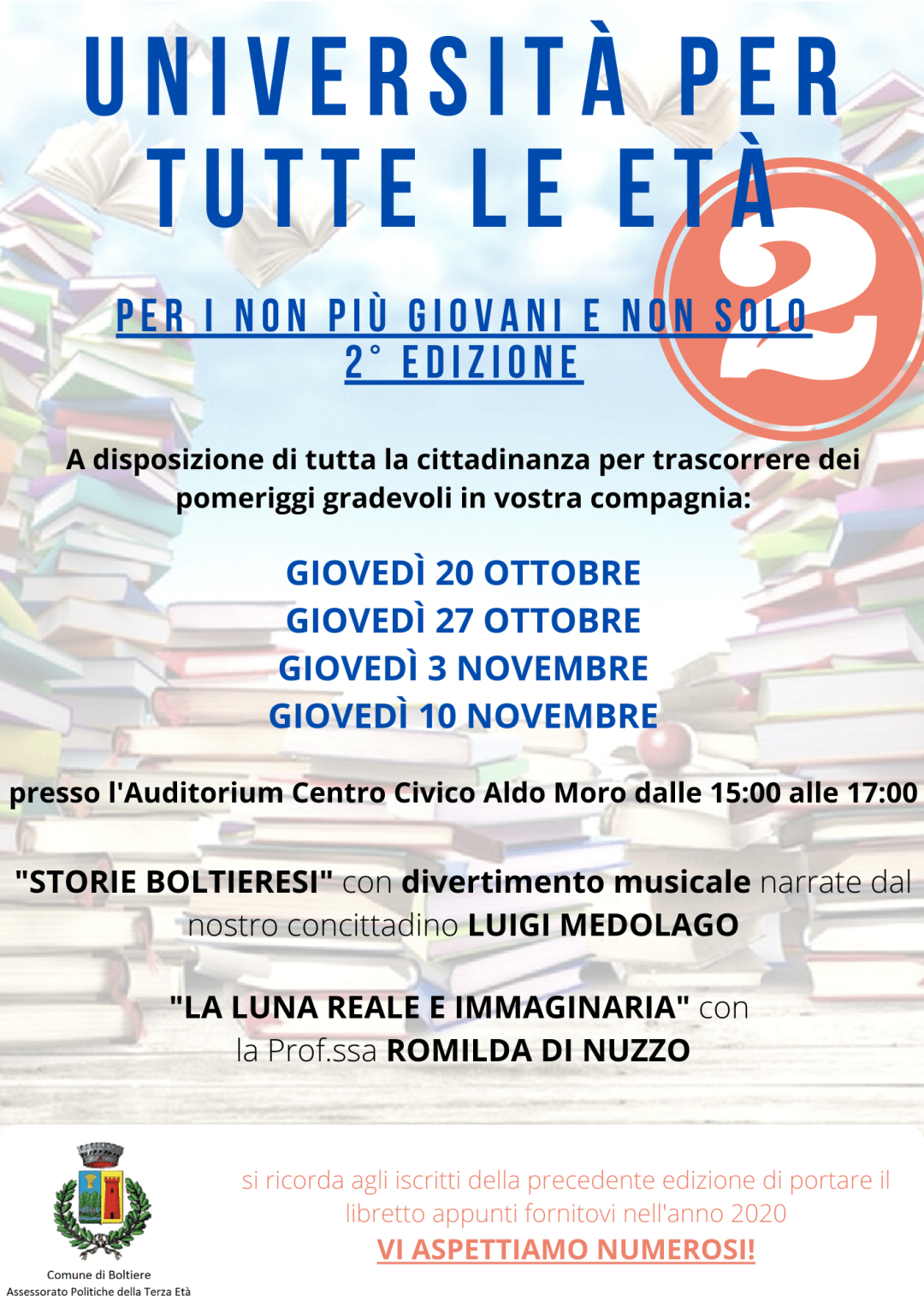 La docente Romilda Di Nuzzo curerà due incontri dal titolo “La luna reale e immaginaria”, mentre altri due incontri vedranno un volto noto di Boltiere: Gigi Medolago, infatti, racconterà “Storie Boltieresi”.