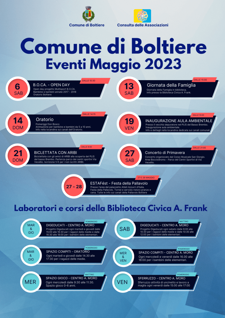 Con la collaborazione dell’Amministrazione Comunale, della Consulta delle Associazioni e della Biblioteca Civica Anna Frank, il Comune di Boltiere ha pubblicato il calendario delle iniziative e delle manifestazioni in programma per il mese di maggio appena iniziato.