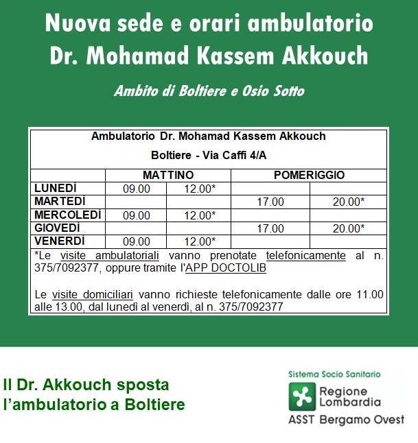 L’ATS di Bergamo ha comunicato che, a decorrere da giovedì 15 giugno 2023, il Dott Mohamad Kassem Akkouch, che opera nell’ambito territoriale dei Comuni di Boltiere e Osio Sotto, trasferirà la sede del proprio ambulatorio medico nel Comune di Boltiere in Via Caffi 4/A.