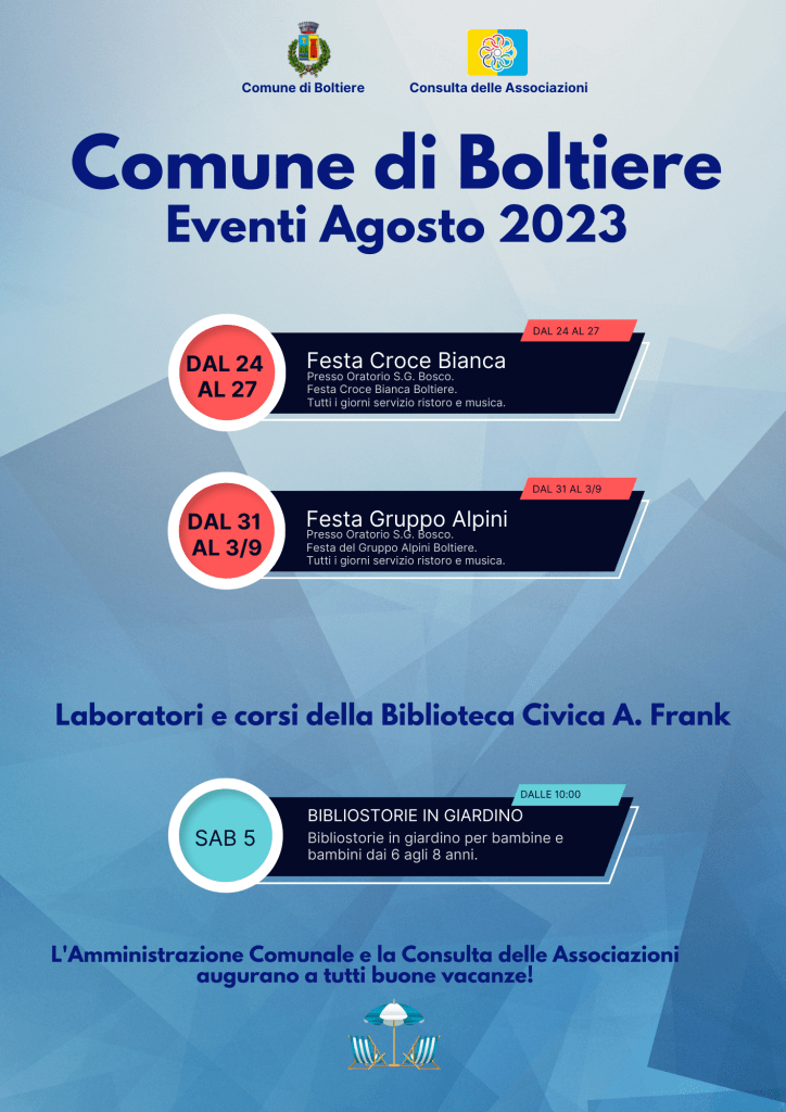 A fine agosto, dal 24 al 27, è in programma presso l’Oratorio S.G. Bosco la festa della Croce Bianca Boltiere, dove tutti i giorni è previsto servizio di ristoro e intrattenimento musicale. La settimana successiva sarà invece il turno del Gruppo Alpini, con la Festa Alpina dal 31 agosto al 3 settembre, la quale darà così il via al settembre boltierese.