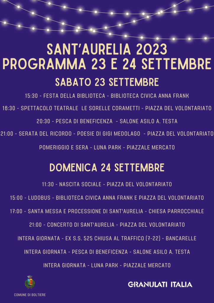 È alle porte il weekend di Sant’Aurelia. Sabato 23 settembre e domenica 24 due giorni di iniziative nel Comune di Boltiere.