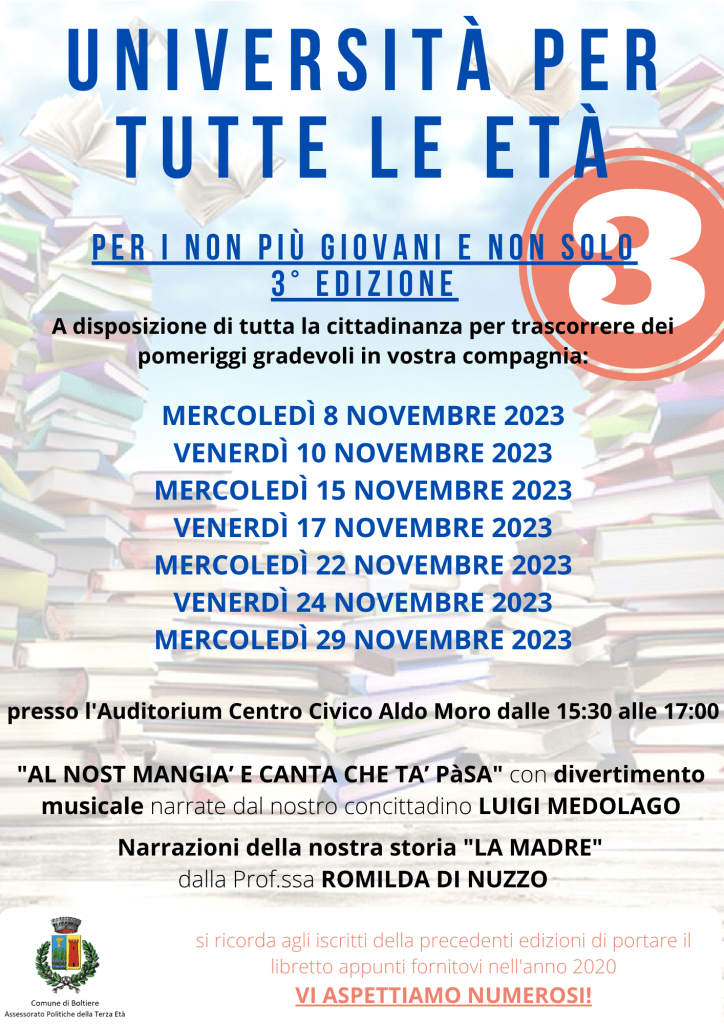 Il luogo dove si svolgeranno sarà l’auditorium del Centro Civico Aldo Moro. Per l’edizione 2023 gli incontri previsti son ben sette, sempre dalle 15:30 alle 17:00. Lo docente Romilda Di Nuzzo curerà gli incontri del venerdì, e tali appuntamenti avranno il titolo di “La madre”. Primo incontro con la Professoressa Di Nuzzo il 10 novembre.