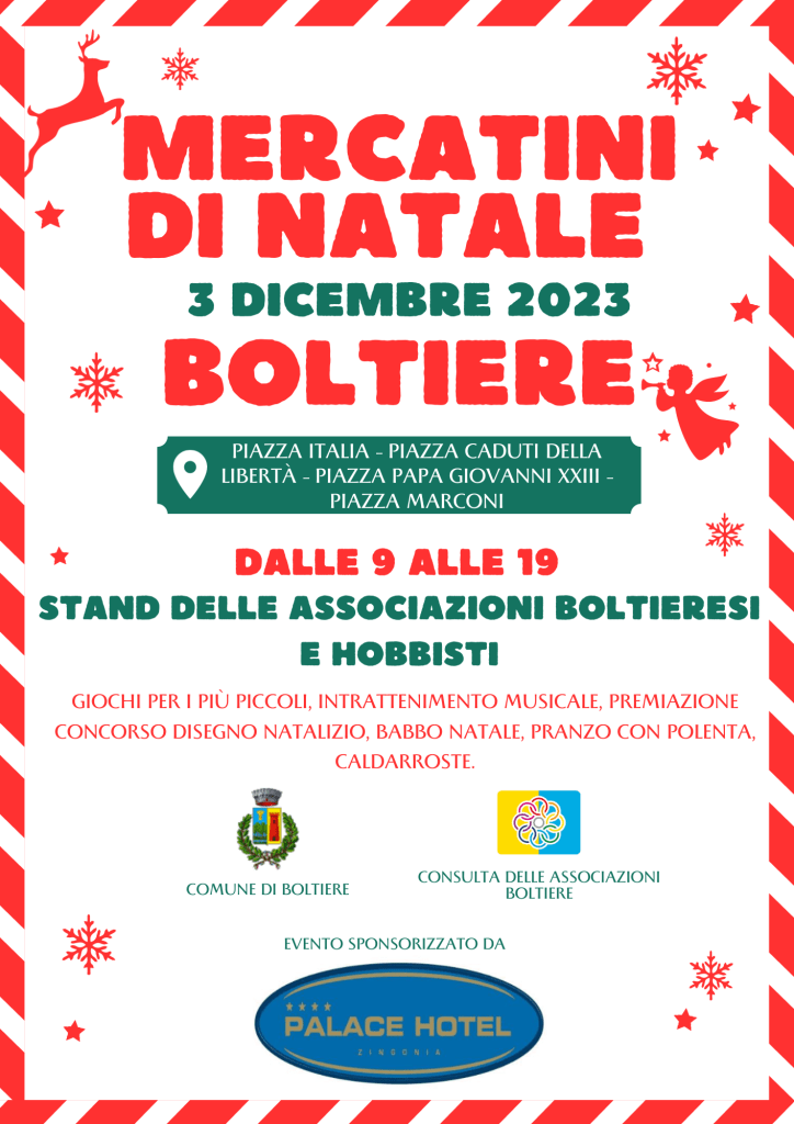 Con l’entrata nel mese di dicembre inizia uno dei periodi più attesi dell’anno, ovvero quello del Natale. Anche il Comune di Boltiere insieme a tutta la sua comunità si sta preparando alle prossime festività. Per domenica 3 dicembre sono previsti i Mercatini di Natale. Si svolgeranno nella piazze circostanti la Chiesa Parrocchiale (Piazza Italia, Piazza Caduti della Libertà, Piazza Papa Giovanni XXIII). Grazie alla collaborazione tra l’amministrazione comunale e le associazioni coordinate dalla Consulta, il programma della giornata sarà intenso: area giochi per i più piccoli, intrattenimento del Corpo Musicale San Giorgio, tenda Alpina, e nel pomeriggio sarà possibile incontrare Babbo Natale all’Hotel Villa Zoia. I mercatini vedranno la presenza di più di trenta stand tra hobbisti e associazioni boltieresi. L’evento è stato sponsorizzato dal Palace Hotel di Zingonia.