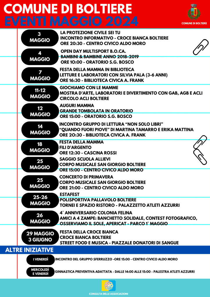 É stato pubblicato sui canali del Comune di Boltiere il calendario delle iniziative in programma nel mese di maggio.