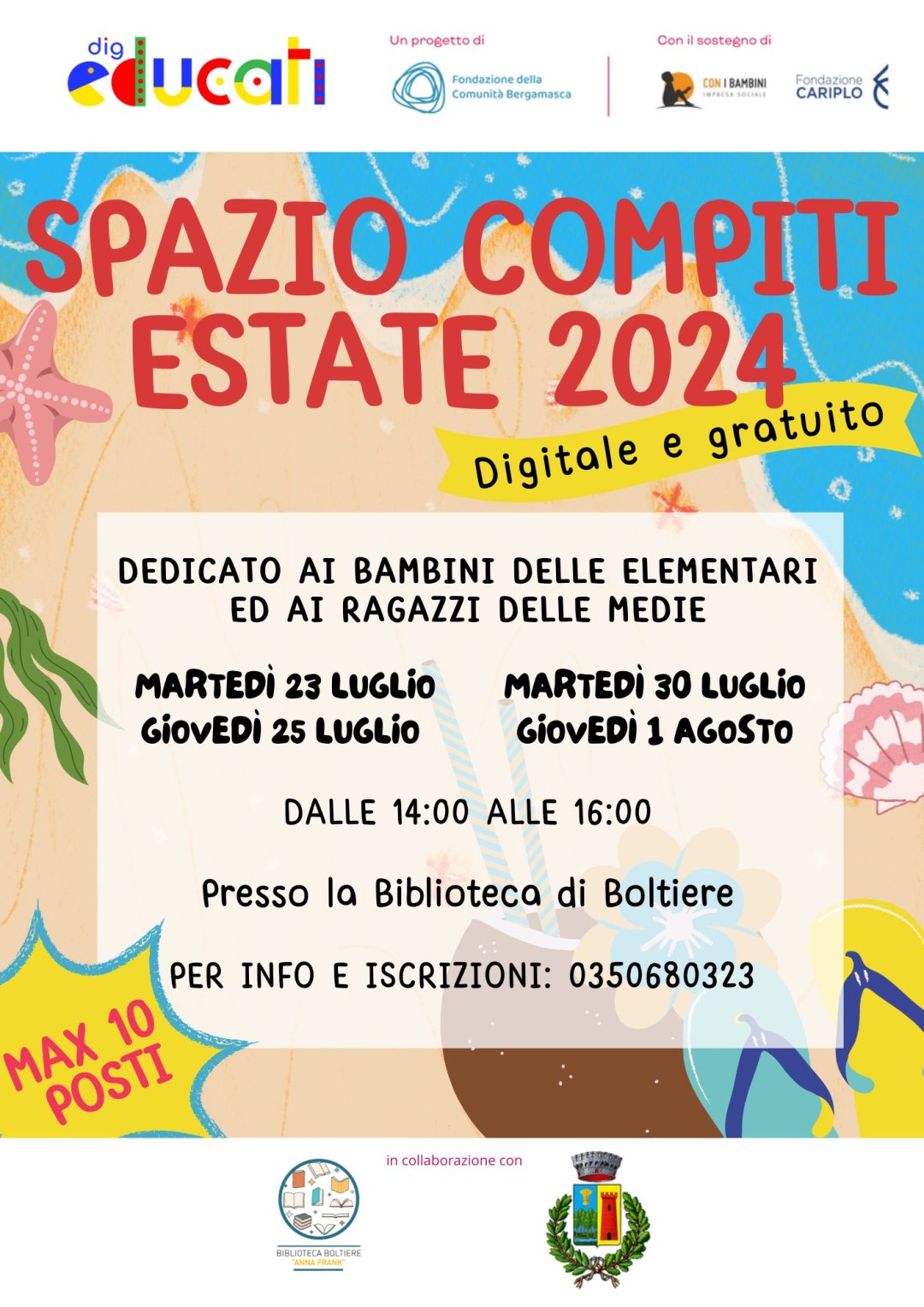 A partire da martedì 23 luglio sarà attivo presso la spazio DigEducati della Biblioteca Anna Frank di Boltiere lo spazio compiti.
